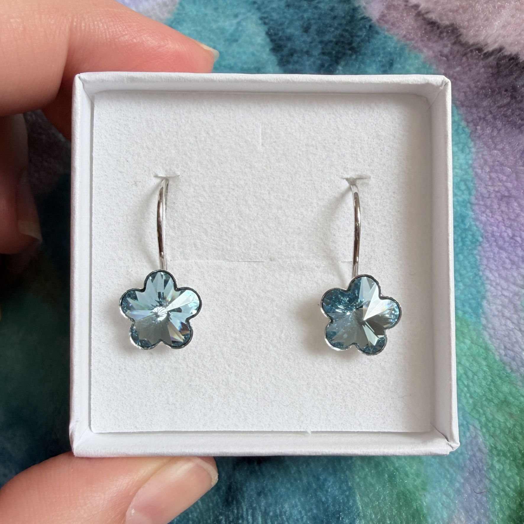 Náušnice ve tvaru květiny s jedním broušeným kamínkem, který krásně odráží světlo.