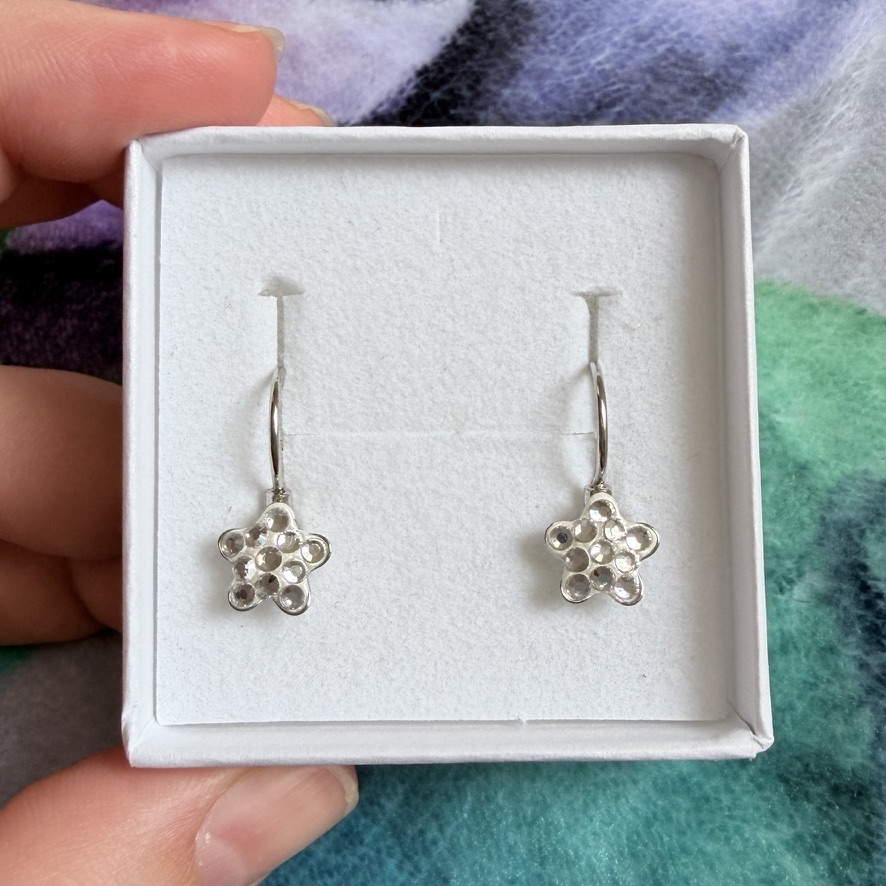 Roztomilé náušnice ve tvaru hvězdičky s růžovozelenými kamínky.