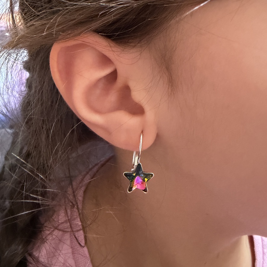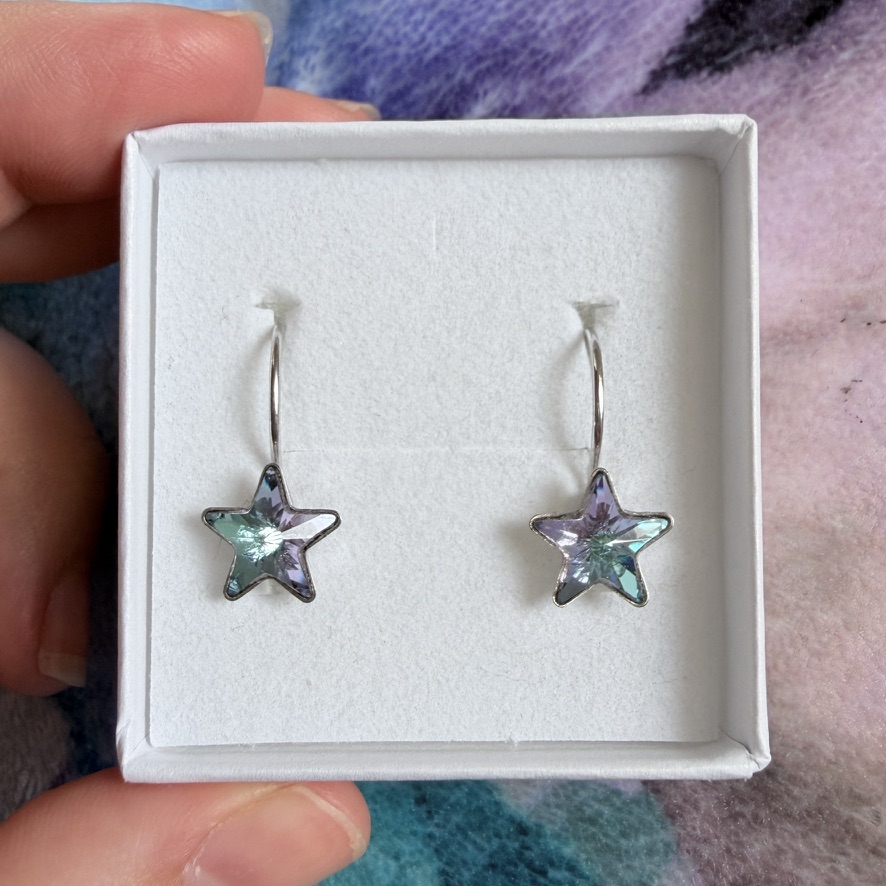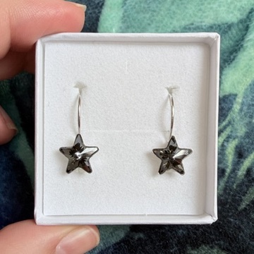Náušnice ve tvaru hvězdičky se šedočernými kamínky.