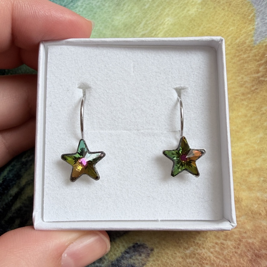 Náušnice ve tvaru hvězdičky s duhovými kamínky s odlesky.